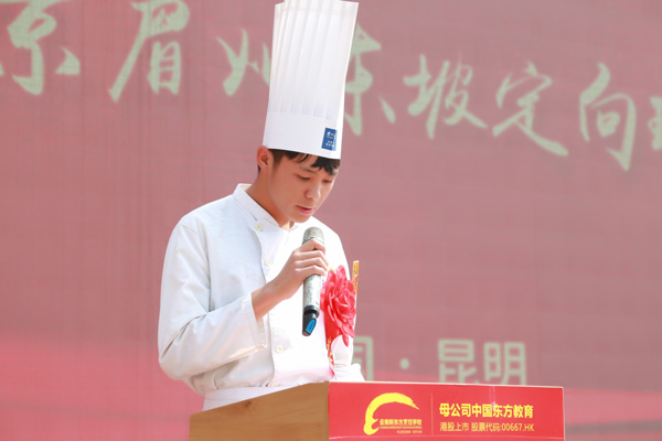北京眉州东坡驻校培训师祁老师说道:“欢迎云南新东方的同学加入眉州东坡的大家庭,你们即将从一名学生转变为一名职员,踏出校门,跨入属于自己的职业生涯,前方的烹饪道路很长,伴随我们的有很多的艰辛与喜悦,我希望大家能用自己的勤奋与悟性来解读,诠释自己的厨道。”