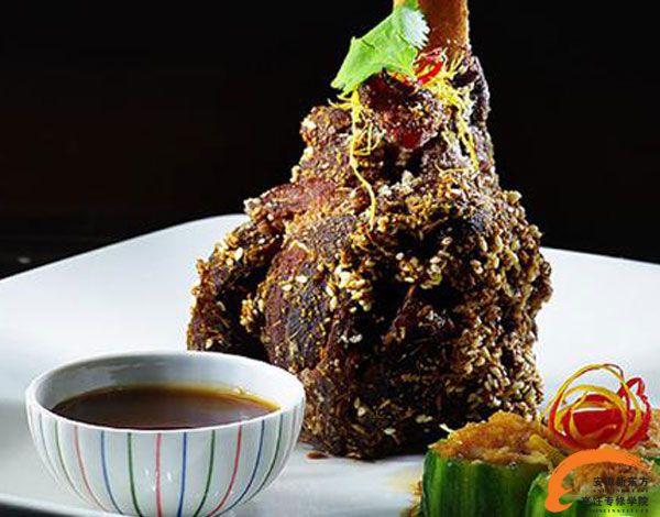 2、至羊肉酥烂离骨入味捞出,剥去纱布,避出原汁备用;丝瓜洗净去皮掏心,金针菇洗净飞水拌蒜蓉酿入丝瓜中,蒸熟淋上美极鲜味汁;锅中放油热至八成油温,将卤好的羊腿表面裹生粉下锅炸至金黄捞出,锅底放黄油煸炒孜然粉均匀裹上羊腿出锅装盘,原汁打芡装入器皿即可。