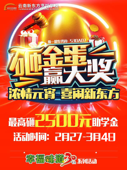 云南新东方也借此佳节到来之际,特地举办浓情元宵·喜闹新东方的元宵活动,就是为了让更多喜爱烹饪的学者能切身体会到新东方的浓情肆意,为此也在浓情元宵的活动期间,免费推出西点、中餐烹饪与膳食营养体验课和到校参观者可免费赠送新年大礼包等活动,还有就是凡是到校报名学习者还可享受浓情元宵·喜砸金蛋等红包活动。