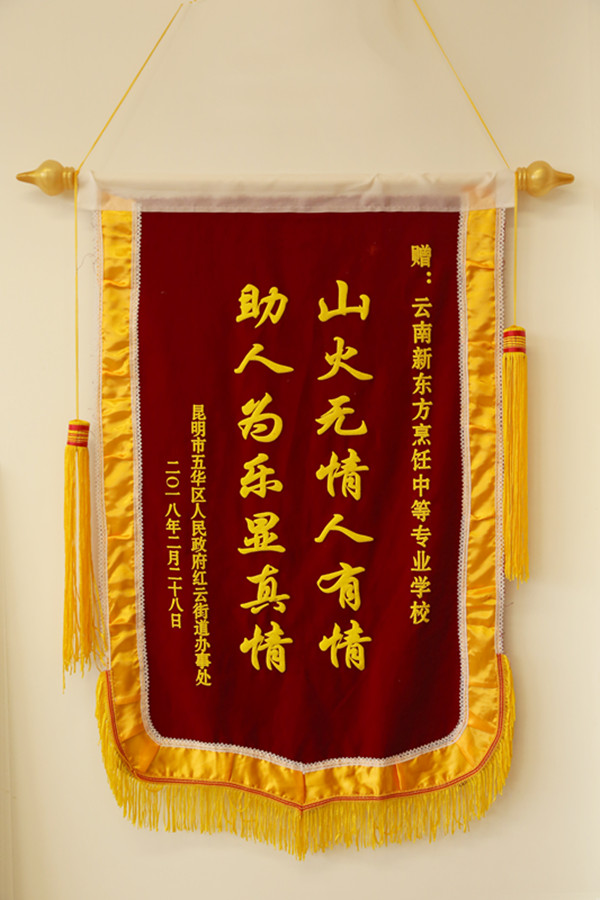 大火熄灭后,生活又恢复到了往常的宁静。就在3月的第一天,昆明市五华区人民政府红云街道办事处的党委书记等随行人员来到云南新东方烹饪学校岗头村老校区,联系到我校的学生管理处王绍华主任与李金洪老师,他们非常感谢在灭火期间,云南新东方对他们大力的支持与帮助。并授予了我校“山火无情人有情 助人为乐显真情”的荣誉锦旗。