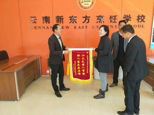 大火熄灭后,生活又恢复到了往常的宁静。就在3月的第一天,昆明市五华区人民政府红云街道办事处的党委书记等随行人员来到云南新东方烹饪学校岗头村老校区,联系到我校的学生管理处王绍华主任与李金洪老师,他们非常感谢在灭火期间,云南新东方对他们大力的支持与帮助。并授予了云南新东方烹饪学校“山火无情人有情 助人为乐显真情”的荣誉锦旗。