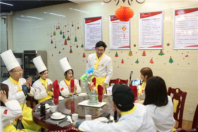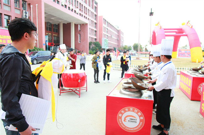 在综合楼前,新东方西点专业琳琅满目的毕业作品展吸引了主播们驻足欣赏与拍摄,被学子精湛的专业技能而折服。随着不远处霸气的鼓声响起,装满沙子重达十斤的铁锅在新东方学子手中瞬间完成推、拉、送、扬的动作,这整齐划一、气势磅礴的新东方基本功——“击鼓翻锅”顿时让刚入学的插班生们震惊万分。在随后东方盛宴的参观中,八大菜系与中华宴席的完美融合,不仅展示了新东方大师高超的烹饪技能,更是对中华传统宴席文化的沿袭与传承。