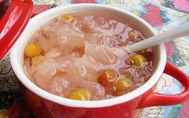 材料:干银耳、樱桃、蜂蜜(可用冰糖代替)