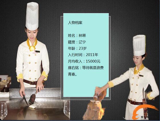 铁板烧厨师不仅仅是一般的厨师,还是营养学家、沟通高手、营销专家。他们不再藏身于后厨,而是在所有客人面前展示自我,而这也正是铁板烧厨师的薪资比一般厨师薪资高的原因。