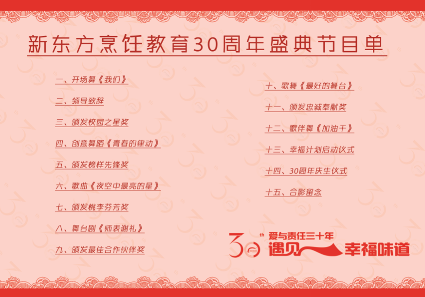 新东方烹饪教育用30年时间陪伴了无数学子成长,30年来,风锤雨炼,开创烹饪教育新模式;30年来,励精图治,铸就烹饪教育知名品牌;30年来,辉煌历程,打造职业教育的标向杆。用30年的时间去践行自身价值和地位,时至今日,她已经30岁了。