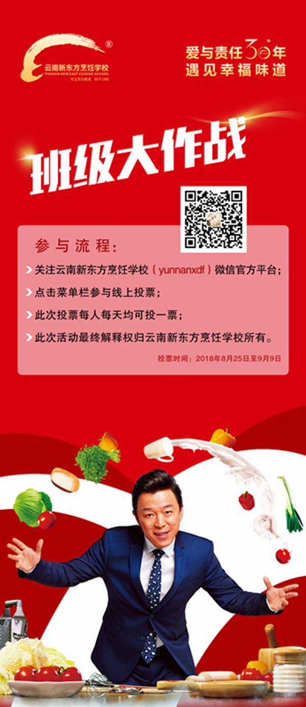 大家期盼已久的“班级大作战”活动将于8月24日(星期五)在云南新东方烹饪学校举办。“班级大作战”意指通过班级与班级之间的PK赛,来检验同学们在校期间学习的成果。