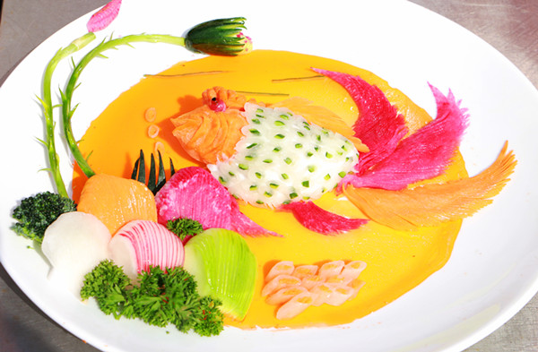 花色冷拼在宴席程序中是与就餐者见面的头菜,它以艳丽的色彩、逼真的造型呈现在人们面前,让人赏心悦目,食欲大增,使就餐者在饱尝口福之余,还能得到美的享受。在宴席中能起到美化和烘托主题的作用,同时还能提高宴席档次。