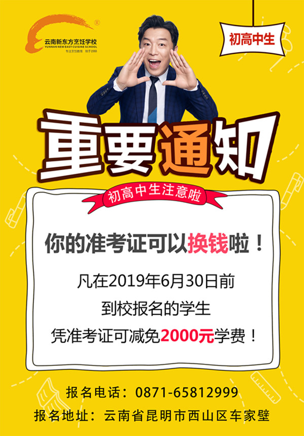 小编知道,单单以文字的形式来让你了解学校是远远不够的,若是有时间欢迎你带上家人、朋友一起来云南新东方烹饪学校实地考察一下,好学校不怕被比较。学校还针对高考生开设了免费体验课、美食品鉴等等,只要你想来体验或品尝现在就可拨打0871-65812999预约时间老师为你安排。记着把准考证带着哟。