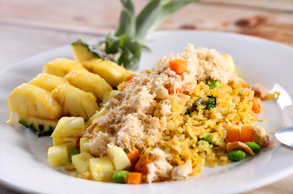 材料:肉松、鸡肉、菠萝、青豆、胡萝卜、鸡蛋、葱