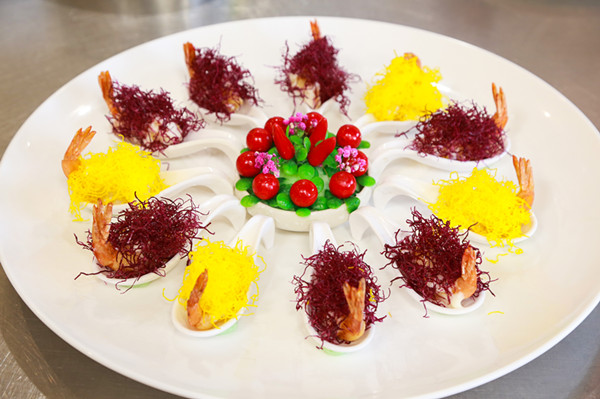 王庆学大师这次为同学们带来了两道具有代表性的菜品。一道是“百香果煮雪花鱼”另外一道则是“双丝大虾”。据悉,这两道菜品不管是从选材还是切配或是到制作,王大师都是亲力亲为。他对同学们说:“一名优秀的厨师在烹饪菜品的时候,不管是选材还是切配还是制作,都应该自己亲力亲为的去完成。因为自己烹饪的菜品需要什么原材料,应该做出什么样的味道,这些都只有自己了解,且这样的菜品做出来才是真正的完美。”