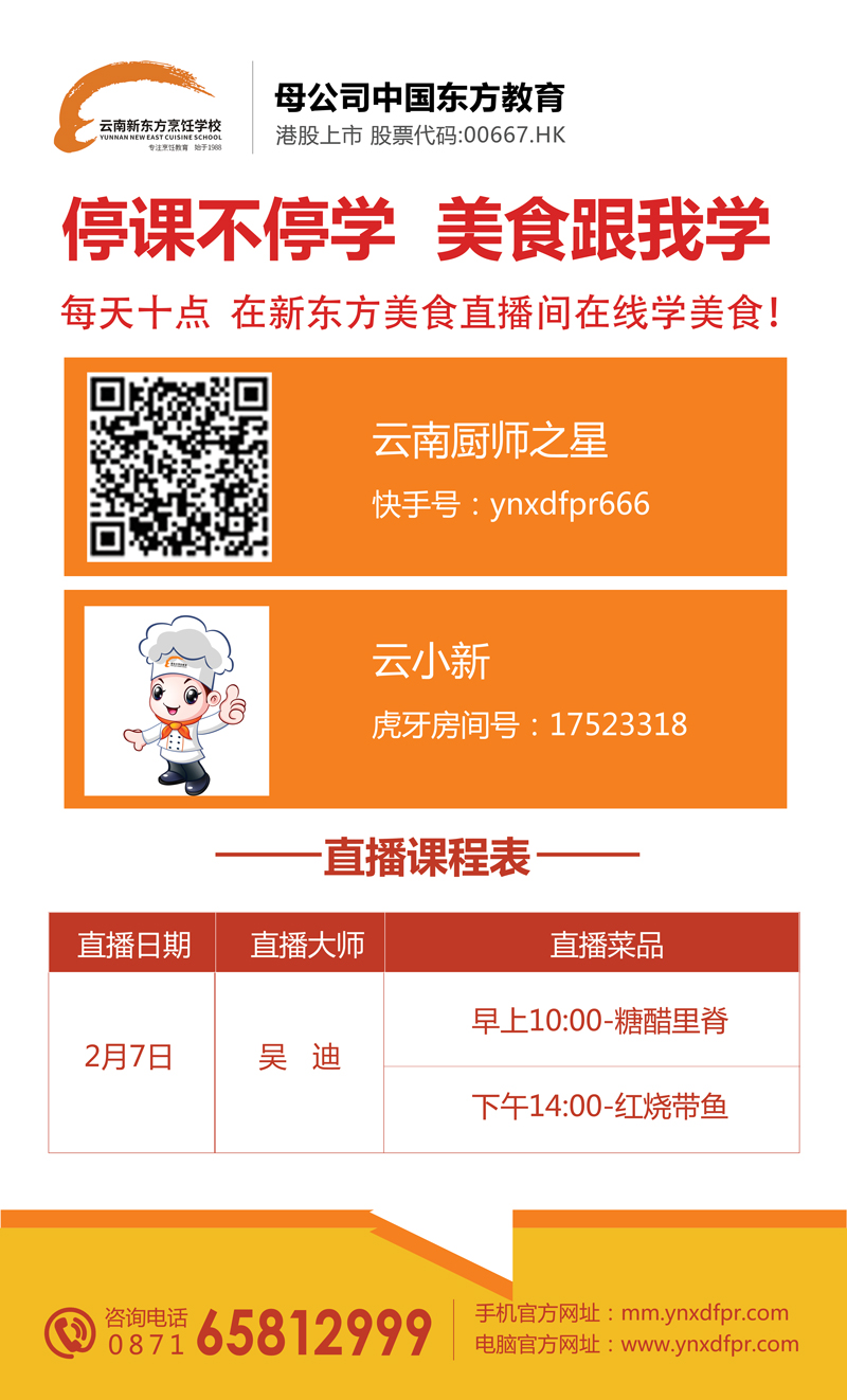 同学们、家长们,好消息!云南新东方烹饪学校虎牙直播平台在千呼万唤中开通了,想要学习厨艺的小伙伴们从今天开始又多了一个学习的平台。
