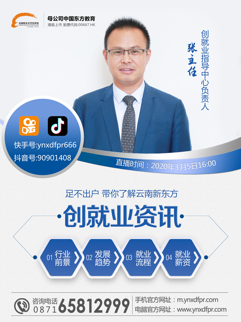 为了让新报名的学生和家长对云南新东方烹饪学校创就业情况有个全面了解,更好给自己一个合理的定位,进而更快适应校园生活,明确今后学习方向。经研究特举行一场关于创业、就业的主题直播活动,详情如下: