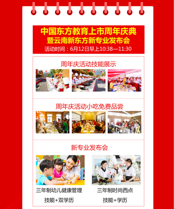6月12日10:30,中国东方教育上市周年庆典暨云南新东方新专业发布会将在云南新东方烹饪学校篮球场隆重举行。
