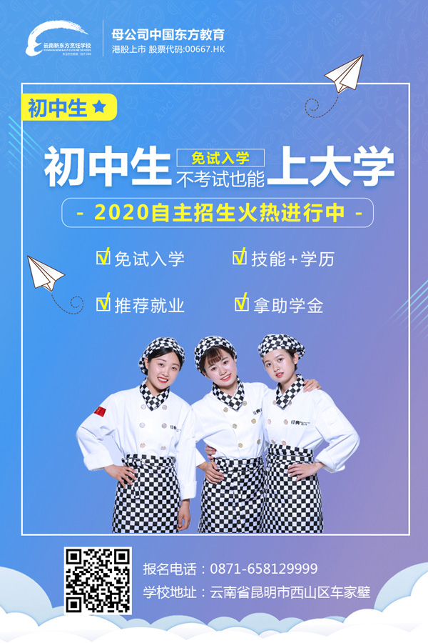 那么,小编告诉你,机会来了。云南新东方烹饪学校2020秋季热门专业预录取正火热抢订中。学一门技术不仅是兴趣爱好,它还是一种谋生手段。对于年龄小的同学来说,更是一个获取更高学历的通道。