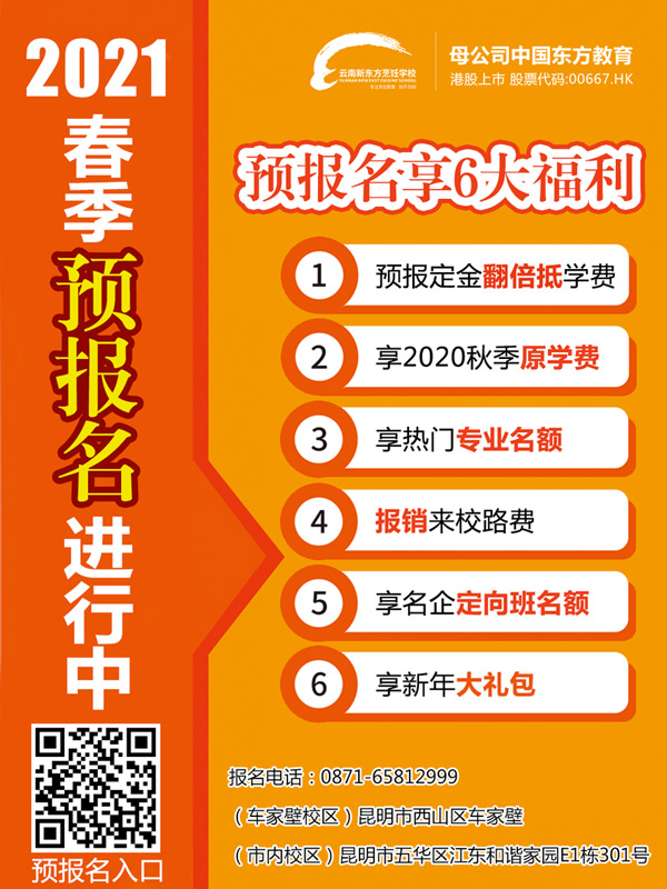 时值年末,云南新东方烹饪学校2021年春季预报名工作已经正式启动,如果你也有一个烹饪大厨梦,你也想像云南新东方烹饪学校学子一样毕业即可推荐就业,那就千万不要错过这一次春季预报名的好机会哟,现在抢占预报名名额还可以选择云南新东方烹饪学校热门专业名企定向班名额,2021年2月11日前报名,还可以享受六大福利。