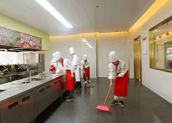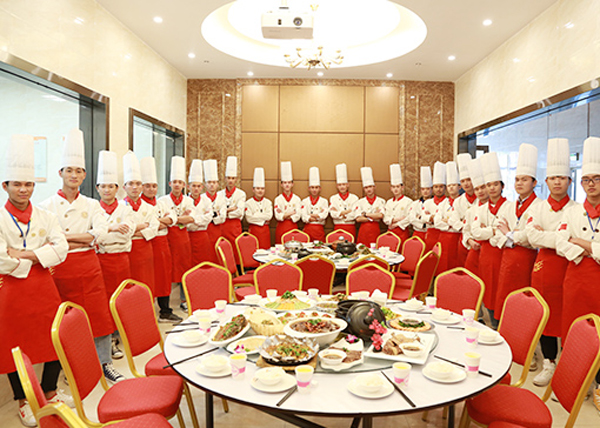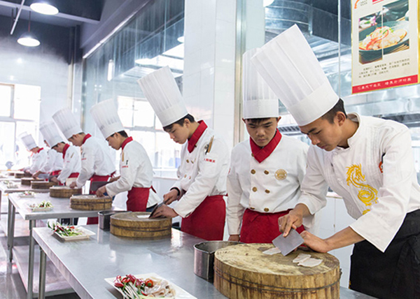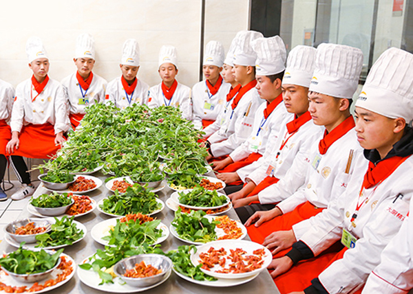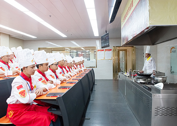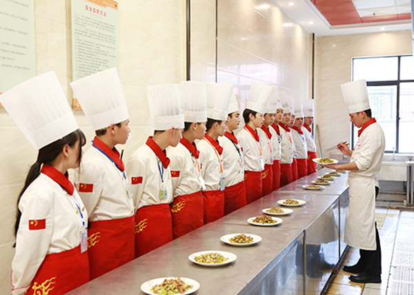 根据实训大厅炉灶数量对班级进行分组实训,学员有序进入实训室,教师组织领料、安排工位,进行原料粗加工、案板切配、炉台烹调、菜品盛装的实训教学。