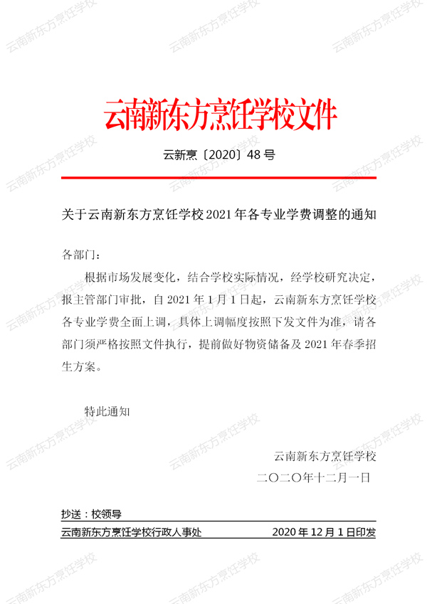 头条|关于云南新东方烹饪学校2021年各专业学费调整的通知
