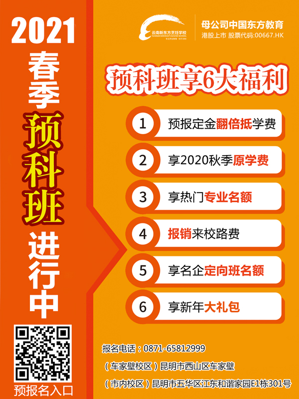 云南新东方烹饪学校为即将到来的2021年的学子们带来的第一份礼物——“2021年春季预科班名额”
