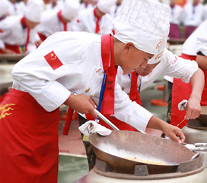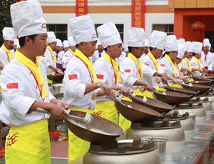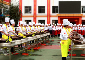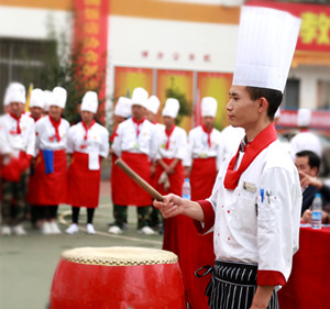 所谓击鼓翻锅是指新东方独创的训练学生翻锅基本功的一项集体活动。伴随着声声鼓声,同学们有条不紊的根据整齐翻锅。击鼓翻锅除了训练学生翻锅的基本功外,还对学生的团队协作能力有一定的帮助,同时还锻炼身体。作为一名优秀的厨师,要烹饪一桌美味佳肴,你不可能单打独斗,必须有伙伴来协助你完成,所以集体荣誉感和集体协作精神也是厨师的必备素质之一。学校集体击鼓翻锅活动无疑对学生的团结协作能力有很大的提升。