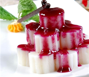 还有更精妙的创新菜式就是我们新东方烹饪的学生自创菜式:红色诱惑。这是用最普通的材料蓝莓和山药烹饪而成。