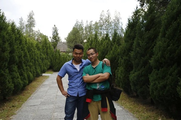 昔日帅气的何老师(左)与同事合影